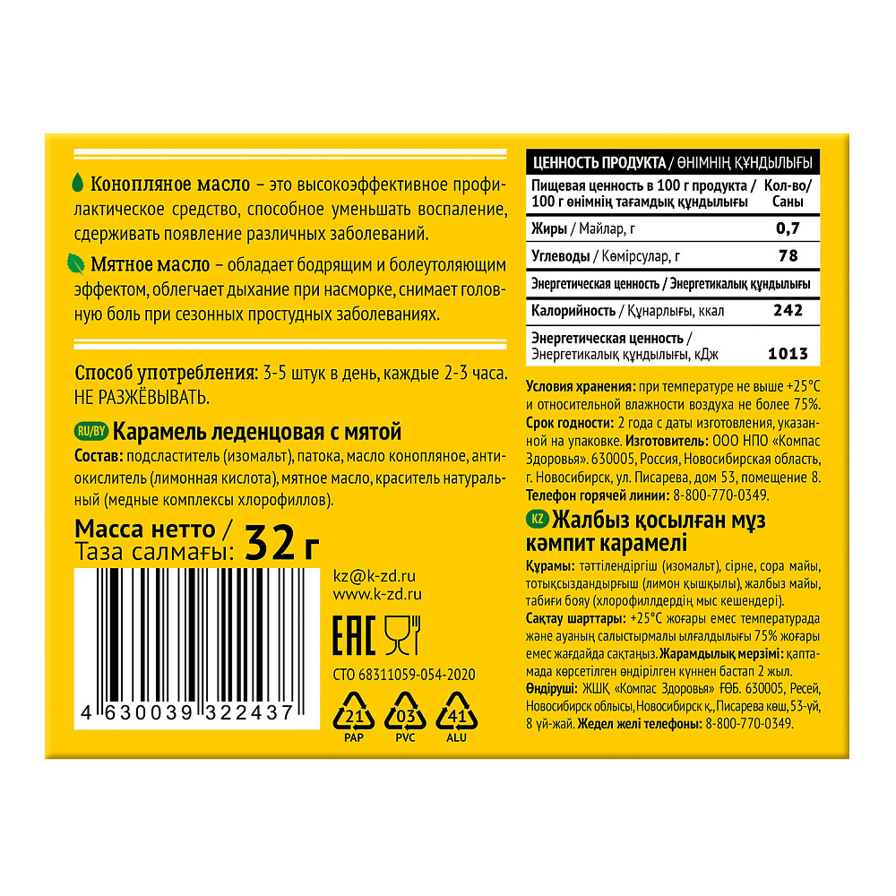 Состав: подсластитель (изомальт), патока, масло конопляное, антиокиситель (лимонная кислота), мятное масло, краситель натуральный (медные комплексы хлорофиллов) .